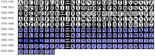 | The date letters below show the background shape for silver. The same letters were used for Gold, which has been marked in Birmingham since 1824, but with a background of a square with cut corners. There may be some variations in backgrounds during the late 19th century, especially on watch cases.