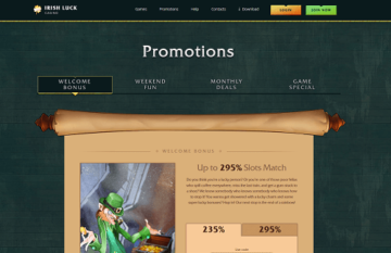 - SHAMROCK – deposit $25+ get 295% match bonus on slots and specialty games.